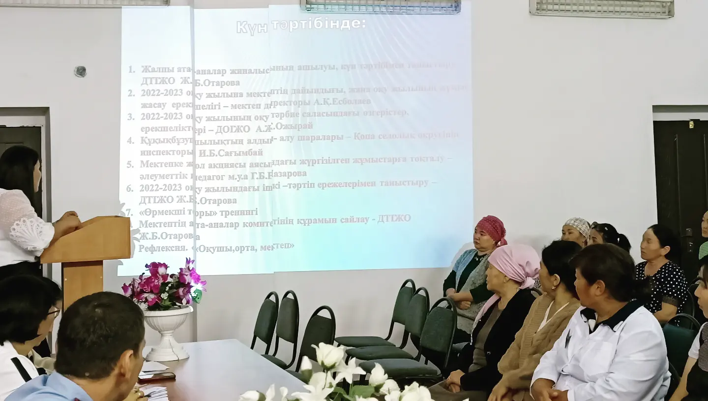 "Қопа орта мектебі КММ-де 2022-2023 оқу жылының алғашқы жалпы ата-аналар жиналысы өтті. Күн тәртібінде: